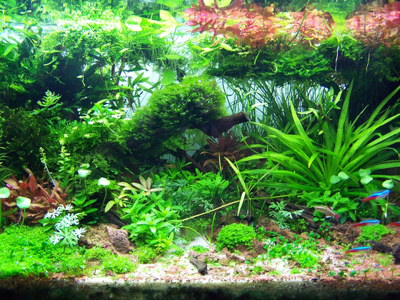 Nagyon szépen elkészült félig Komolyra fordítva,szépen beérett a dzsungeled,viszont most kellene még megtisztítanod a folyómedret,mert elég elég jó hangulata lenne neki,ahogy szépen beível vagy kanyarog a növények közé-alá.Tetszik az emers rész is,ahogy kifutnak a víz alól a növények- nagyon bejövős,olyan természetes hangulata van.