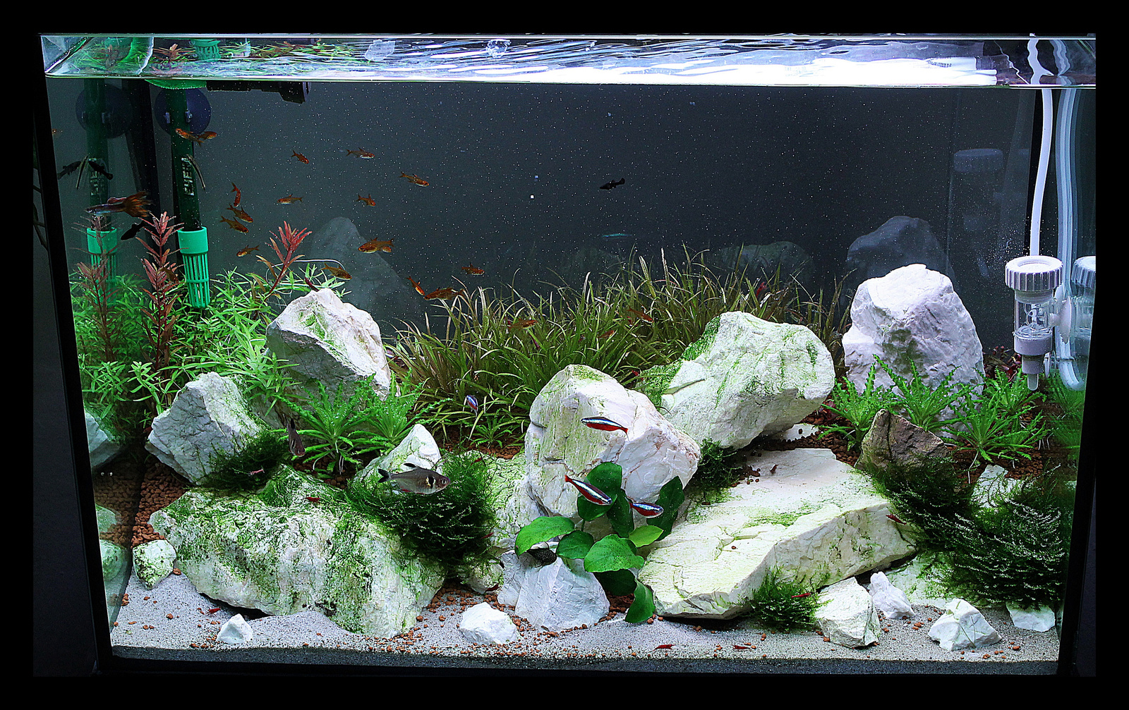 Sziasztok. 5 hetes az akvárium, nem vagyok teljesen megelégedve, nem azt a képet mutatja amit elterveztem. blyxa sűrűsődik de magasságra nem akar nőni, kb 8-10 cm magas. Én azt hittem a duplájára fog nőni. Ez természetes vagy van valami trükk??    A fehér kövek miatt nem tudom hqi-val lőni mert nagyon zöldül. igy csak 72 watt t5 világítom kellően ki emelve.