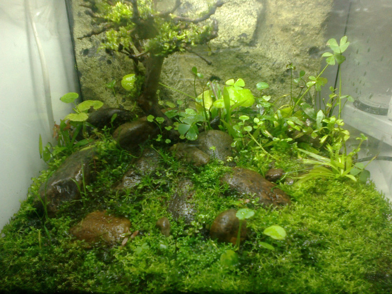 A régi kis akimat selejtezés helyett átalakítottam, igaz víz csak kevés kerül bele az is inkább csak permetezés formájában tehát ez egy emers kísérle lesz vízi illetve mocsári növények számár de mivel már két hetes és még mindíg van benne élet :-D sőt fejlődés is látható ezért pillanatnyalig sikeresnek mondható ez a project!
